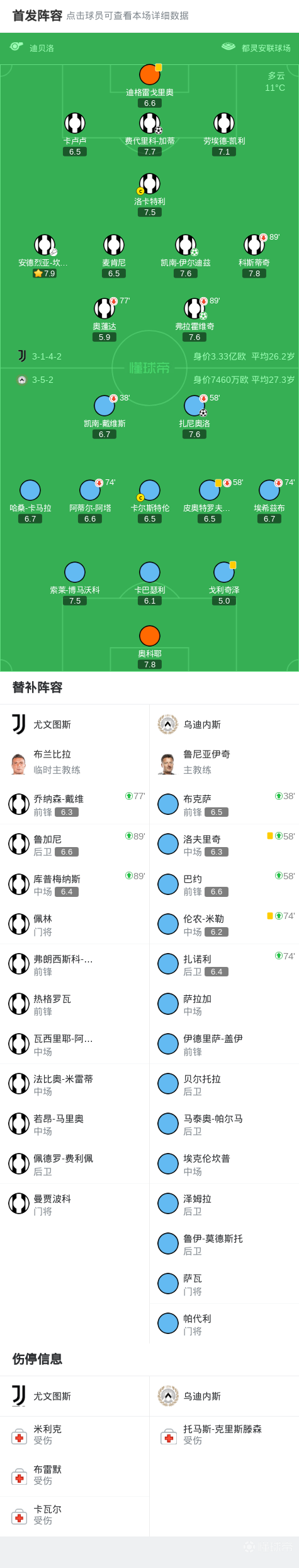 尤文vs乌迪内斯:伊尔迪兹、DV9、科斯蒂奇、奥蓬达首发