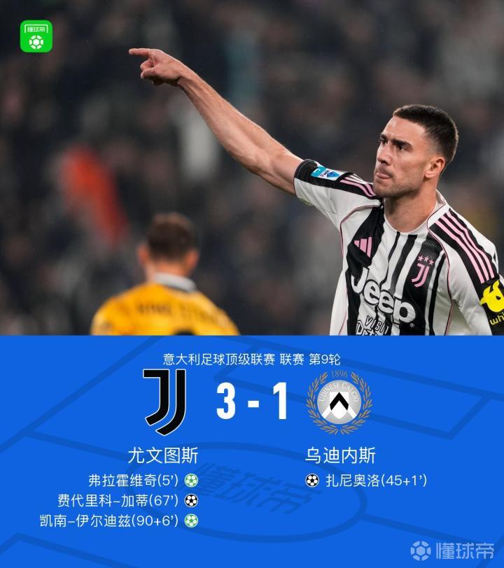 第90+6分钟,伊尔迪兹再次造点,并自信地亲自主罚命中,尤文图斯3-1锁定胜局,战胜了乌迪内斯
